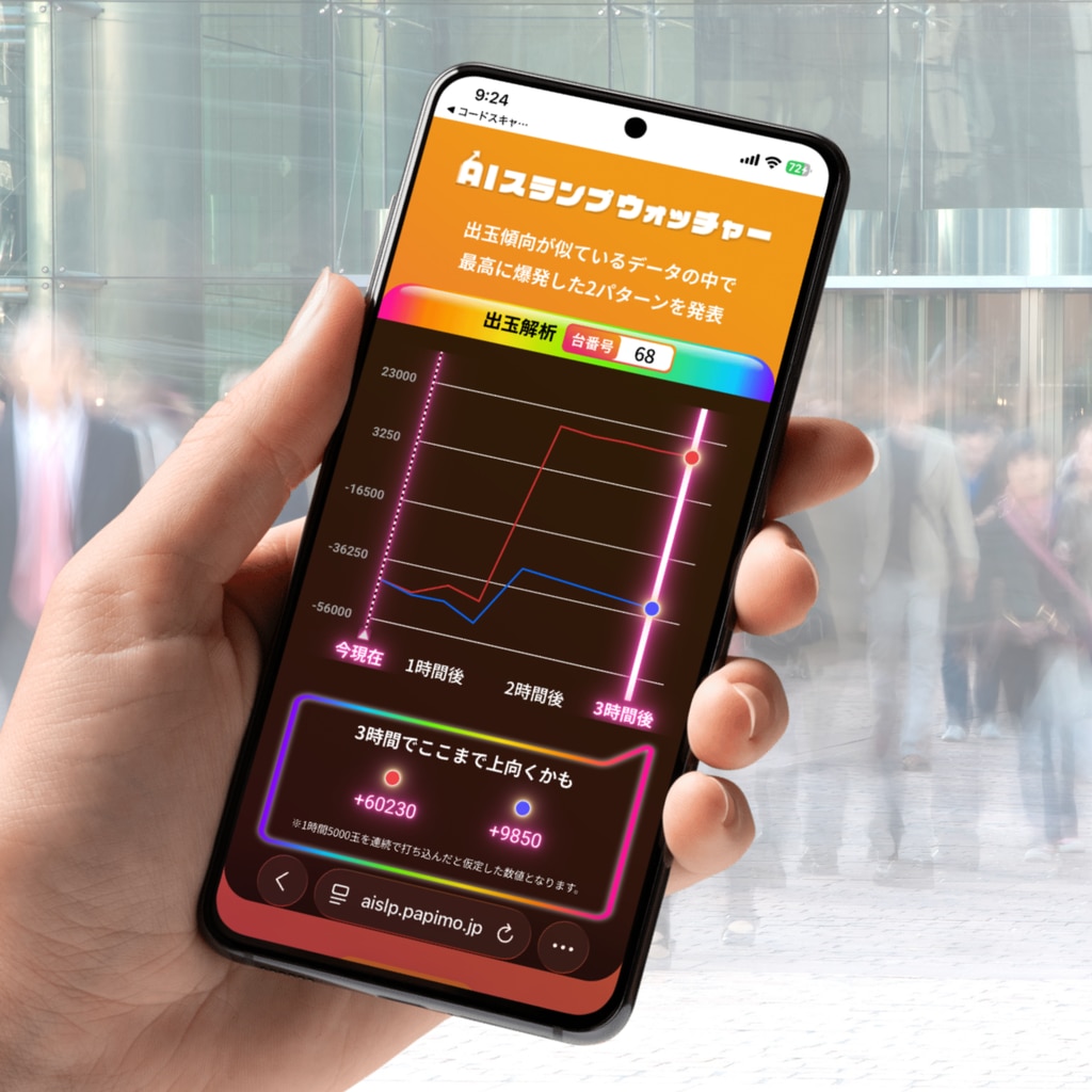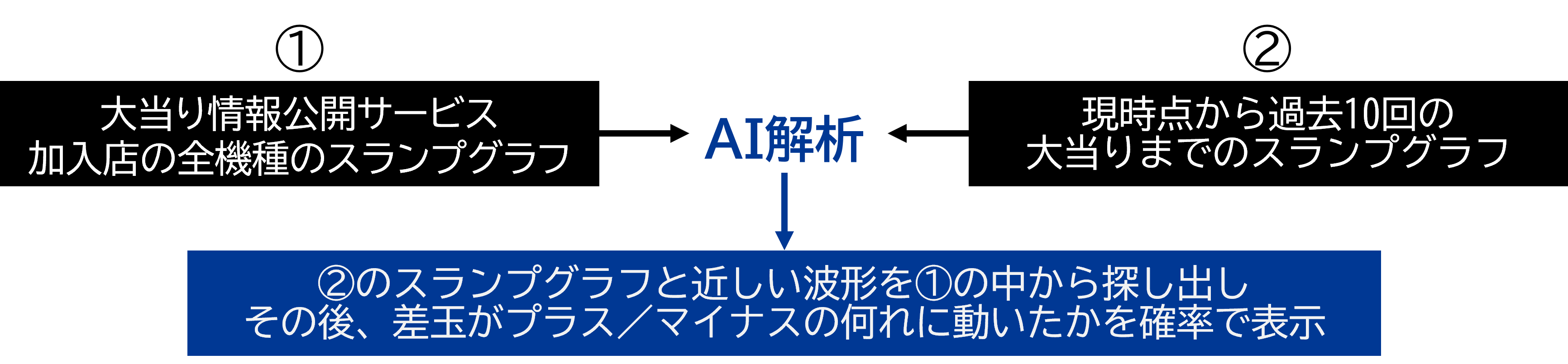 遊技台のスランプグラフデータを使った、AIによる大当りの「波」解析で、波から未来を読む、遊技業界「初」の革新的なAIコンテンツです。大当り情報公開サービスご加盟店さまは「無料」でサービスの追加ができます。