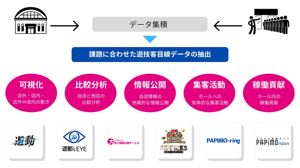 遊技ファンの行動分析に基づいた集客施策と来店数の増加のアシストは、ONEHALLにお任せください。「ONEHALL」は、自店で持っている遊技会員データと、アプリやWebを通して得られるデータを活かし、人目線に立った課題を解決するサービスを統合的に分析・活用するソリューションの総称です。幅広いサービスを展開し、ホール様の業務効率にも寄与しております。