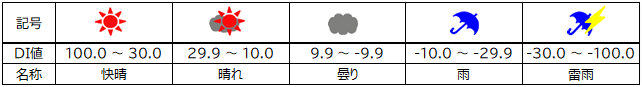 お天気マークは以下のDI値をわかりやすく表示しており、晴れているほど良いと考えて下さい。