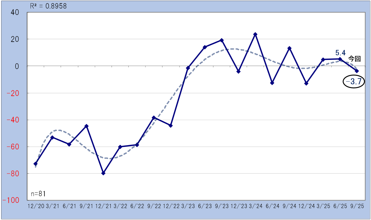 過去1ヵ月の収益や売上、粗利などから判断される「全般的業況」は、前回の5.4ポイントからマイナスに転じ、-3.7ポイント(前回比9.1悪化)となりました。直近は2期連続でプラス圏を維持していましたが、ここにきて業況の鈍化傾向が見られています。