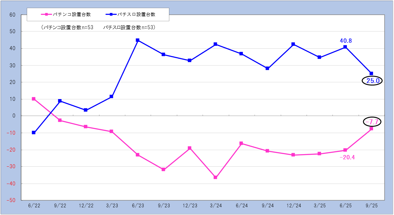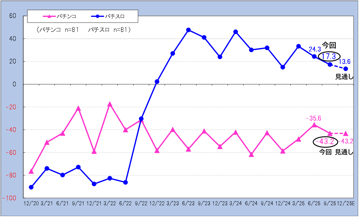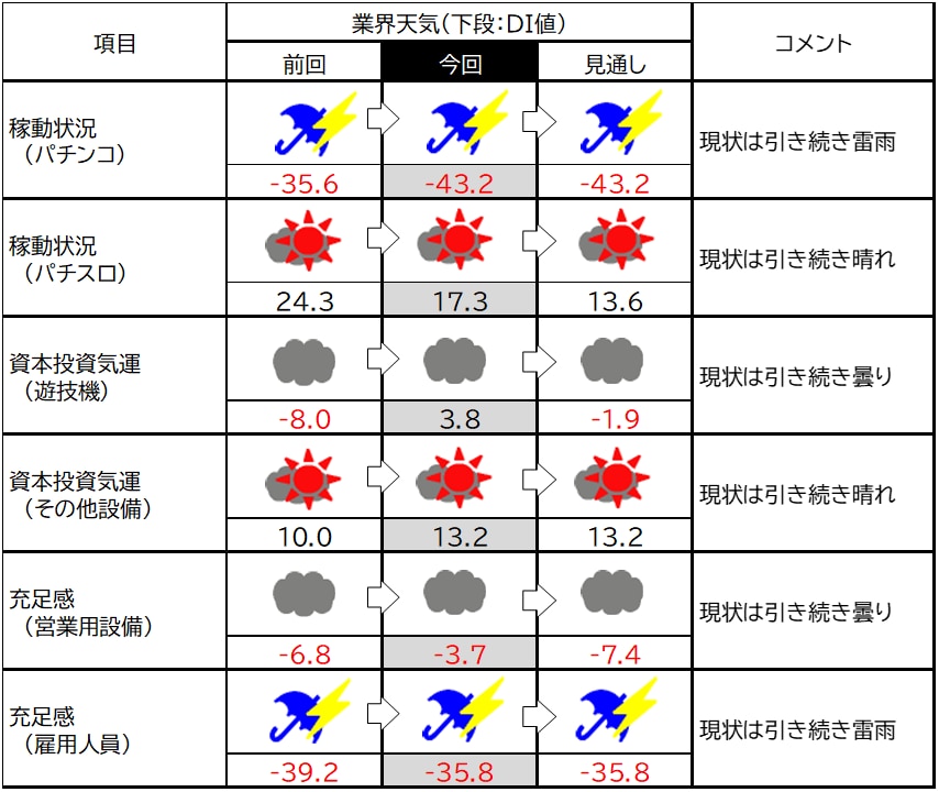 稼働状況は、パチンコが-43.2ポイント(前回比9.0低下)となり、3カ月後も同水準で推移する見通しで、依然として厳しい状況が続いています。