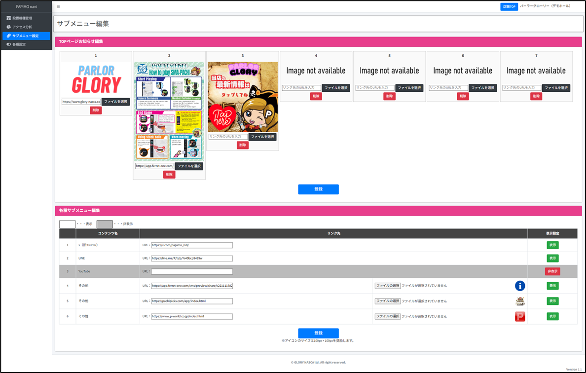 「PAPIMOnavi」は、TOPページに新台入替告知や、出玉ランキング、フロアマップや入場方法、Wi-Fiの設定案内など、任意の告知パネルを掲示できます。