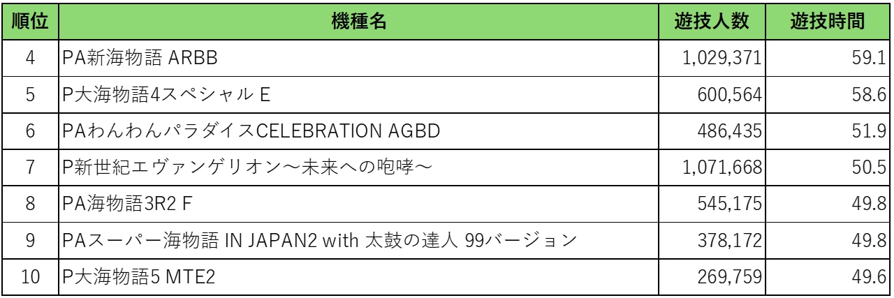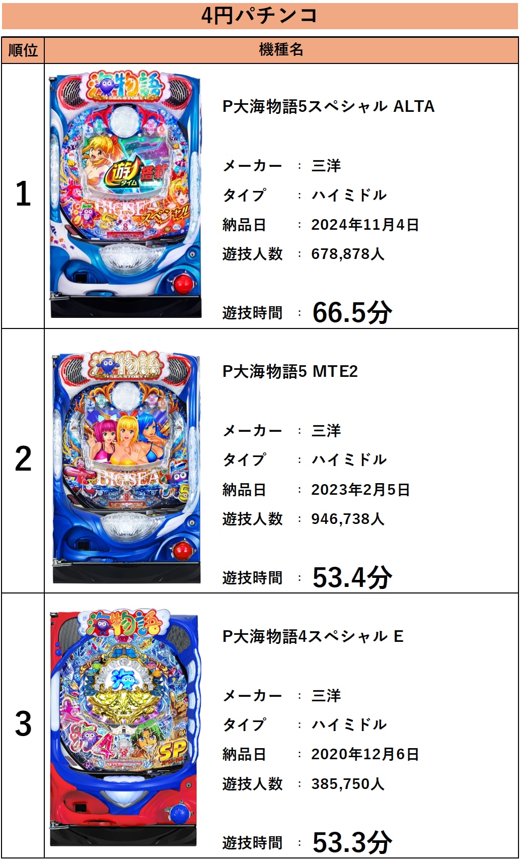 4円パチンコでは、「P大海物語5スペシャル ALTA 」が66.5分で1位となり、大海物語シリーズがTOP3を独占しました。その他の機種では、2021年発売の「P新世紀エヴァンゲリオン~未来への咆哮~」が4位、2023年発売の「Pぱちんこ シン・エヴァンゲリオン Type レイ」が5位とエヴァシリーズも2機種がランクインしています。また、2025年発売の機種では、「e 東京喰種 W」が9位にランクインしました。
