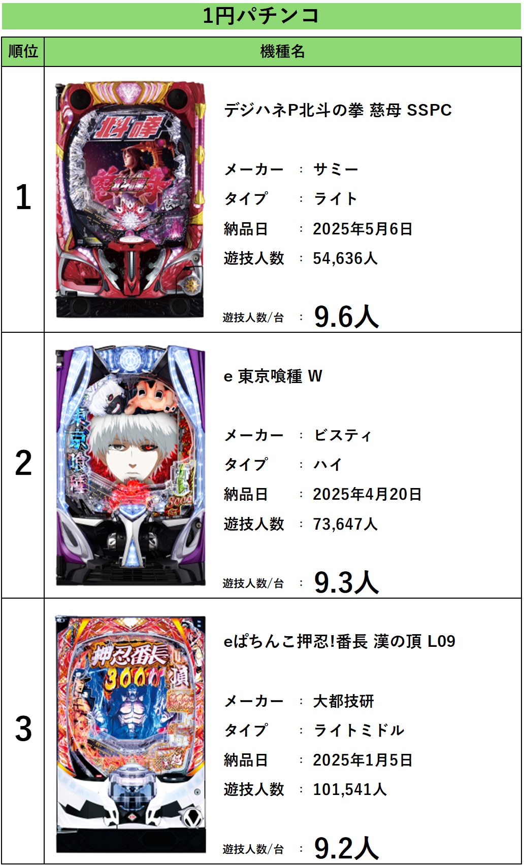 1円パチンコでは、「デジハネP北斗の拳 慈母 SSPC」が1位になりました。4円パチンコと比べると遊技人数が多く、初当り確率の高い機種がランクインしています。