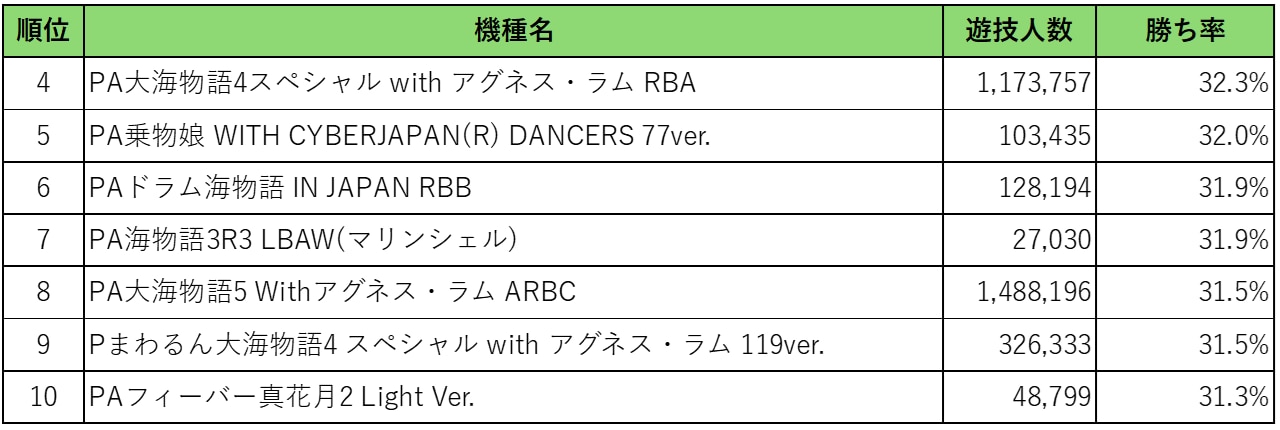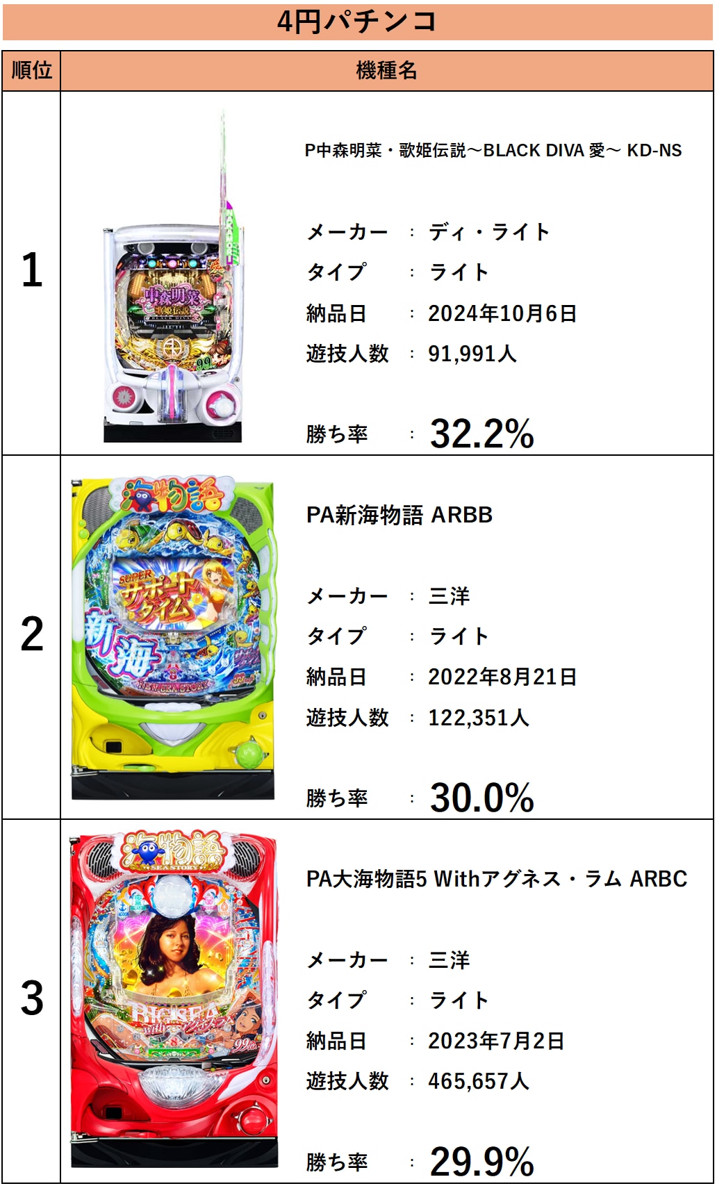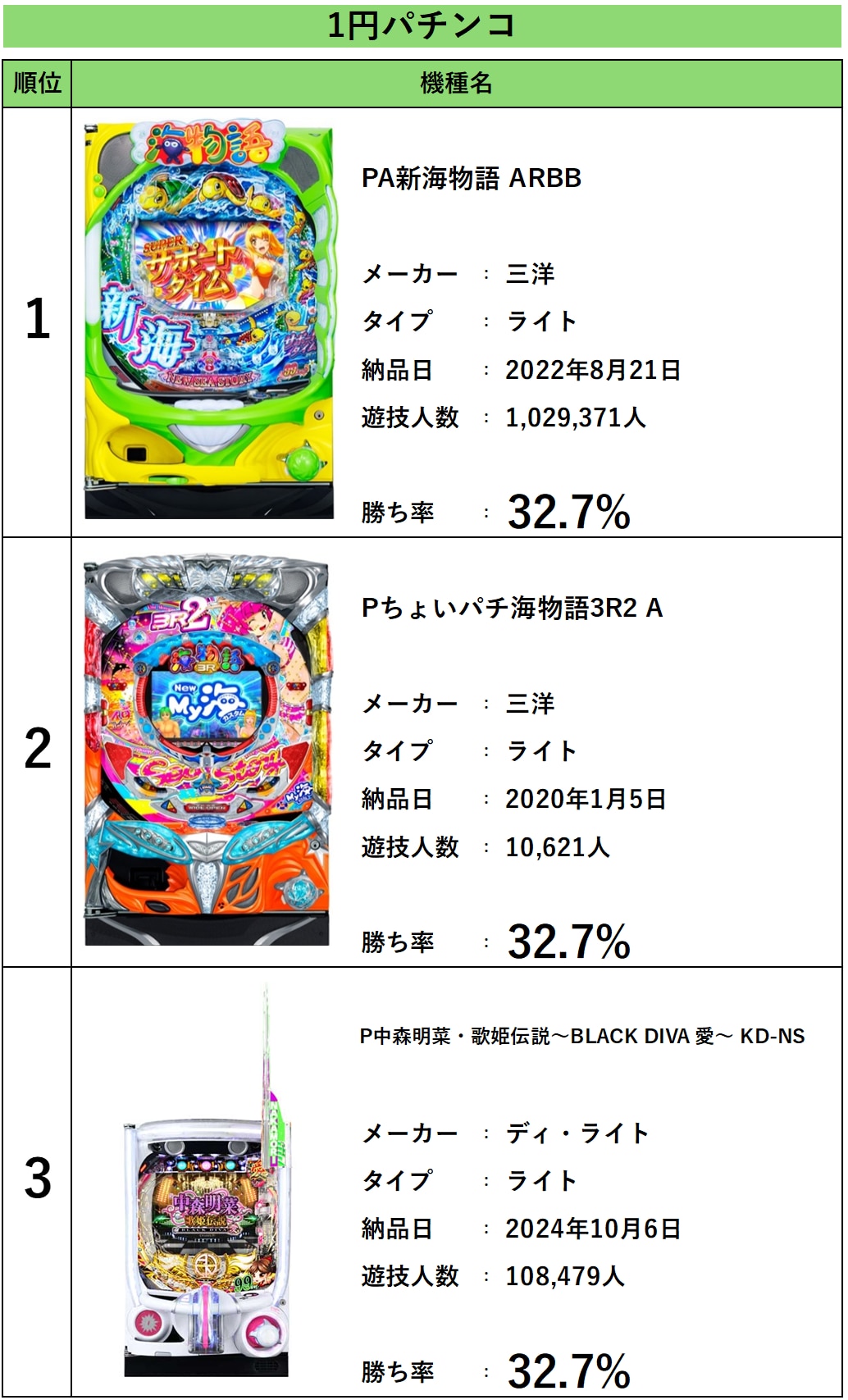 1円パチンコでは、海物語シリーズが7機種ランクインしました。TOP3は僅差となっており、3位には4円パチンコで1位だった「P中森明菜・歌姫伝説~BLACK DIVA 愛~ KD-NS」がランクインしています。また、TOP10の機種はいずれも勝ち率が3割を超えています。